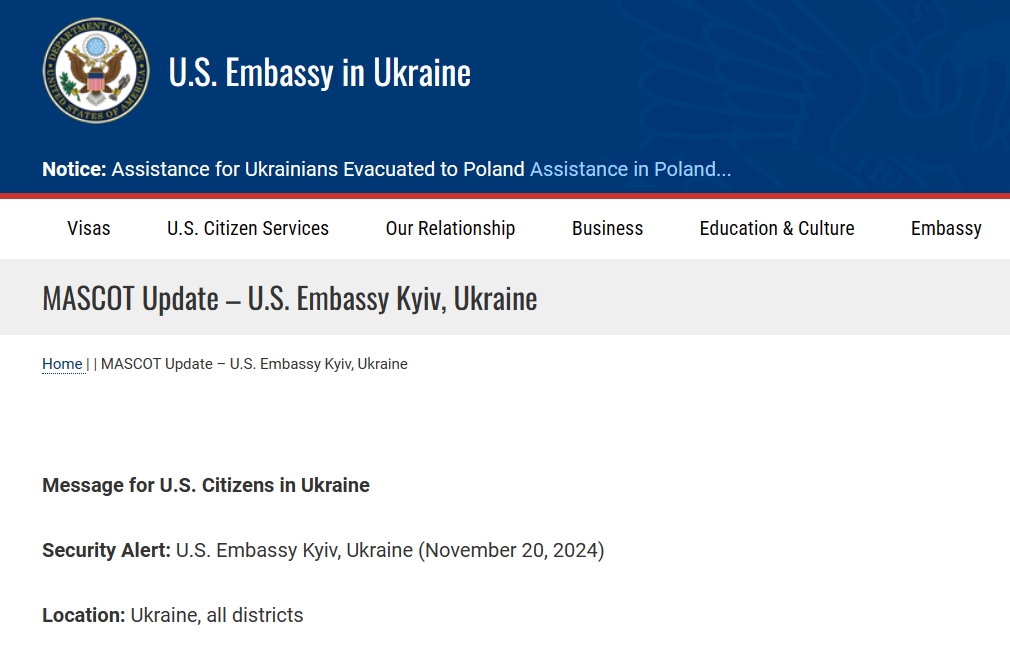财联社11月20日讯(编辑 牛占林)当地时间周三(11月20日),美国驻乌克兰基辅大使馆在官网上发出安全警报信息,称大使馆收到关于11月20日可能发生重大空袭的信息。出于谨慎考虑,大使馆将关闭,使馆工作人员已被指示就地避难。