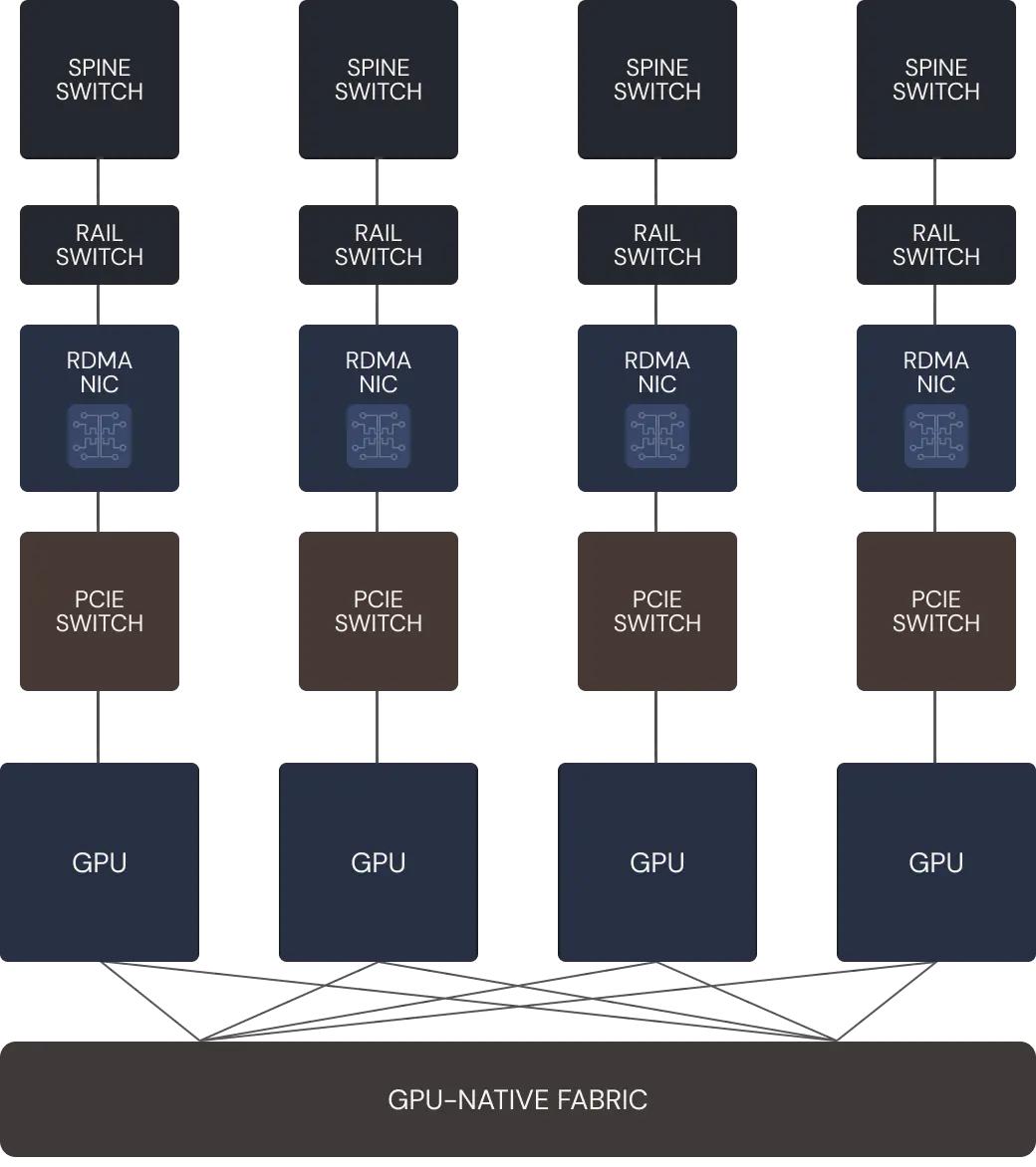 所有这些网络技术往往依赖于专用的网络接口卡(NIC)和交换机。当前,AI服务器的网络组件如NICs、PCIe交换机和Rail Switches,大都像“烟囱式”(stovepipes)结构一样单独存在(如下图所示),彼此之间缺乏统一协调,网络带宽不足,缺乏可靠的容错机制,难以应对AI训练和推理过程中庞大的数据流量。