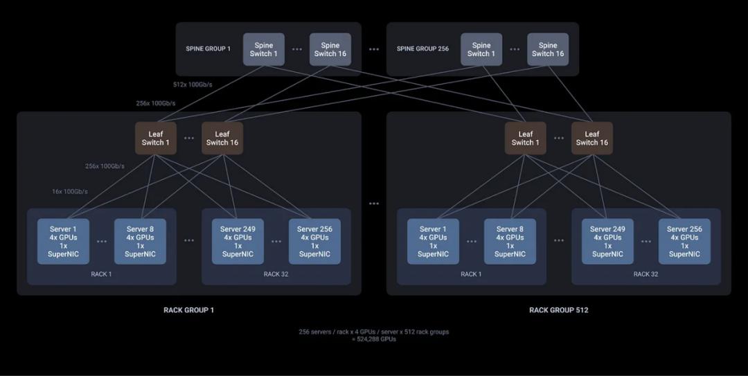 2层500K+ GPU集群设计(跨所有网络层的完整横截面带宽)(图源:Enfabrica)
