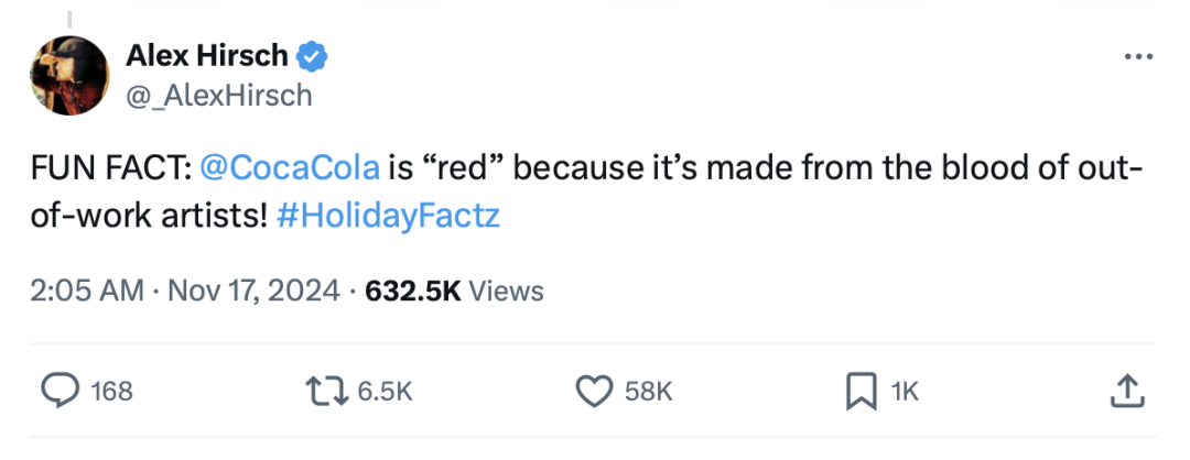 迪士尼动画剧集《怪诞小镇》的创作者 Alex Hirsch 在 X 上评价该广告「有趣的事实:(可口可乐)是『红色的』,因为它是由失业艺术家的血液制成的!」实际上,不仅是艺术家,全面 AI 化下,演员、摄影师、动画师、设计师等等创意产业的岗位,都将被模型开发者取代。