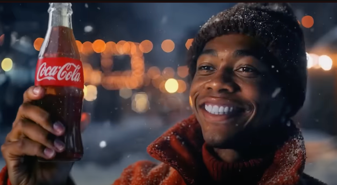 11 月 19 日,可口可乐发布了首支全 AI 生成圣诞广告《假日魔法来了》,广告由 Real Magic AI 生成,时长三十秒,内容致敬了可口可乐 1995 年经典的《Holiday is coming》广告,但所有的画面和人物都是由 AI 生成的。