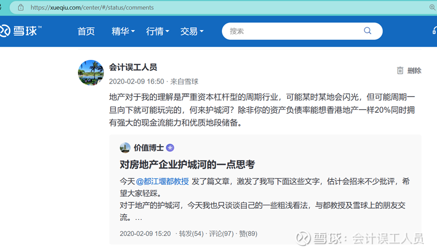 2020-02-09:地产对于我的理解是严重资本杠杆型的周期行业,可能某时某地会闪光,但可能周期一旦向下就可能玩完的,何来护城河?除非你的资产负债率能向香港地产一样20%同时拥有强大的现金流能力和优质地段储备。