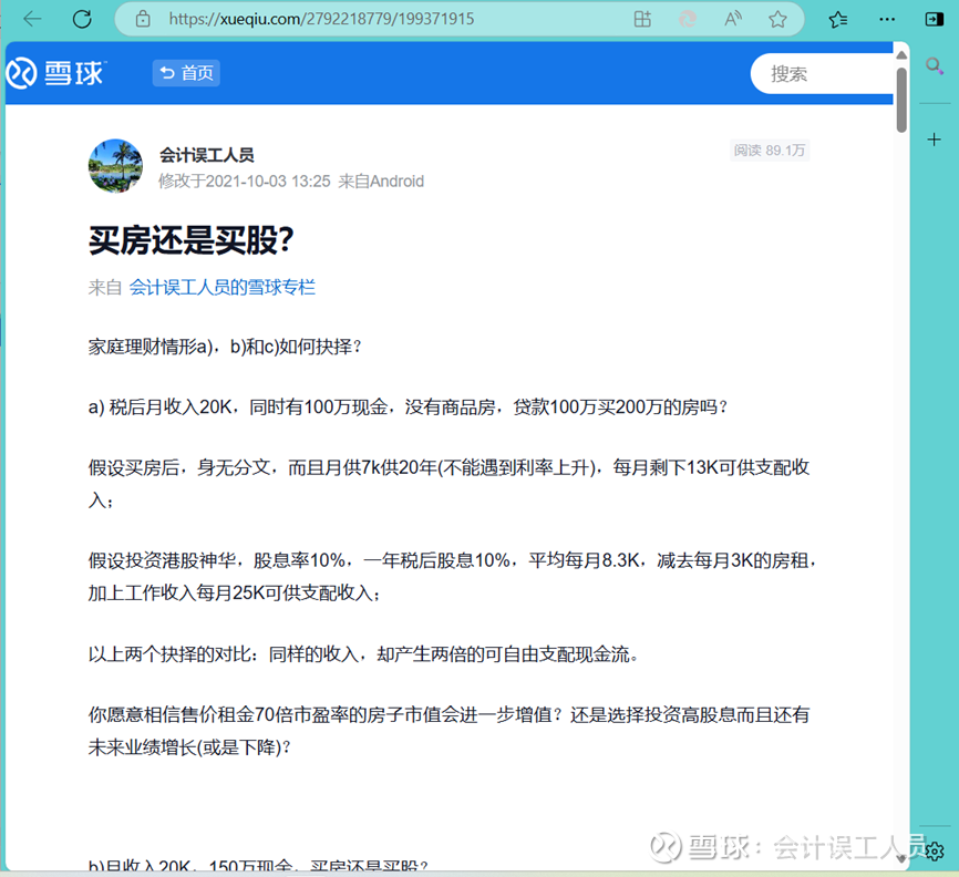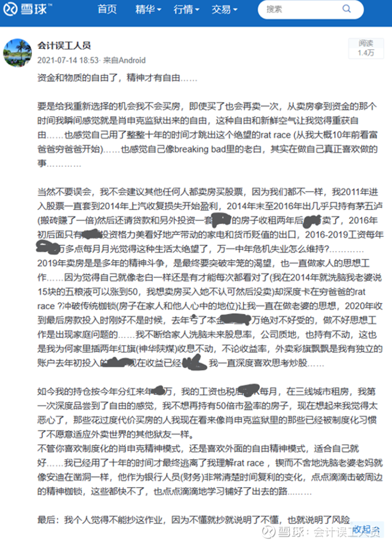 当然不要误会,我不会建议其他任何人都卖房买股票,因为我们都不一样, 2016-2019工资每年XX万多点每月月光觉得这种生活太绝望了,万一中年危机失业怎么维持?…………2019年卖房是是多年的精神斗争,是最终要突破牢笼的渴望,也一直做家人的思想工作……我想卖房买入她不认可然后没卖)却深度卡在穷爸爸的rat race ?冲破传统枷锁(房子在家人和他人心中的地位)让我一直在做老婆的思想,2020年收到最后房款投入时刚好不是时候,2020年山半年亏了本金XX万绝对不好受的,做不好思想工作是出现家庭问题的……我不断给家人洗脑未来股息率,公司质地,也持有不动,这也是我为何家里插两年红旗(神华陕煤)收息不动,不论收益率。
