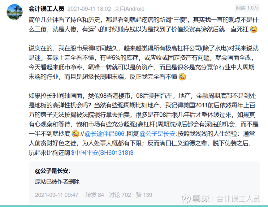 2021-09-11没有三傻只有自己傻,“所有极高杠杆公司(除了水电)对我来说就是迷,实际上完全看不懂,有些5%的库存,或应收或固定资产有问题,就会画面全改,今天看起来第市净率,笔锋一转就可以是负资产,而且是很多是充分竞争行业中大周期末端的行业,而且是超级长周期末端。。。