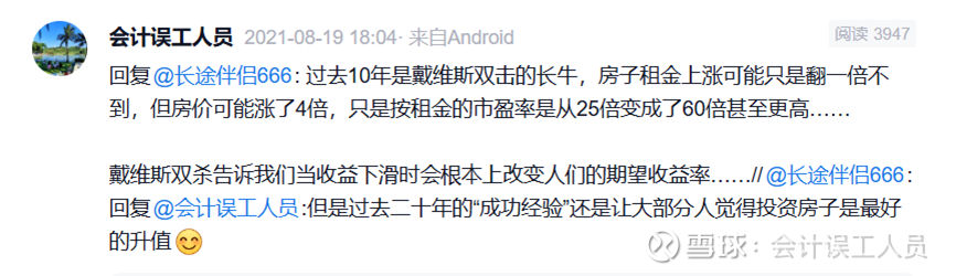 过去10年是戴维斯双击的长牛,房子租金上涨可能只是翻一倍不到,但房价可能涨了4倍,只是按租金的市盈率是从25倍变成了60倍甚至更高……