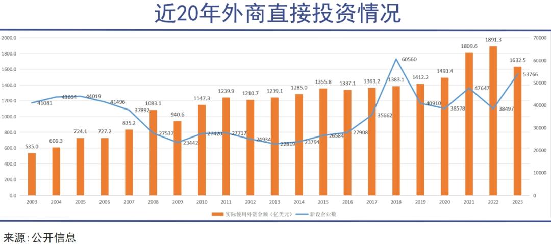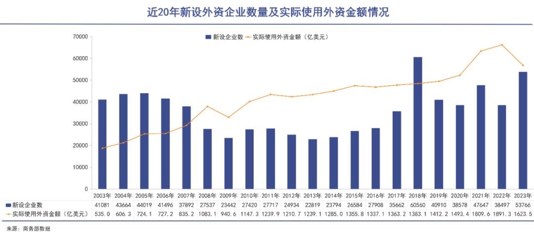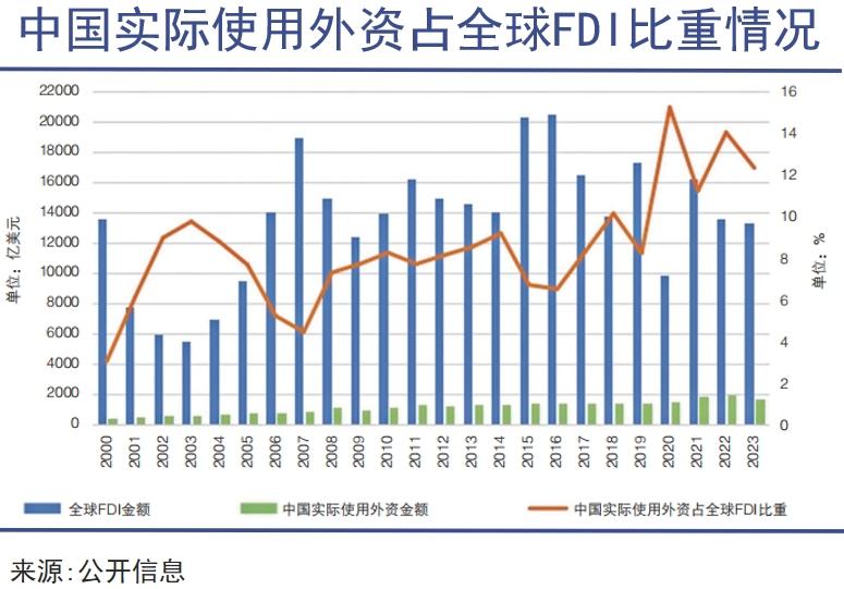 而根据《世界投资报告2024》数据显示,中国实际使用外资占全球FDI比重即便在这两年有所下滑,但是在20多年来,仍然是明显的上升状态。
