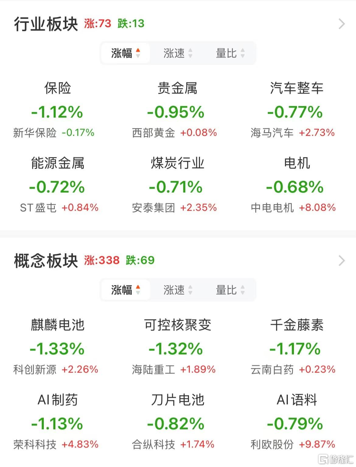 盘面上,深圳本地股持续走强,深赛格、力合科创、深振业A等涨停,深圳昨日发布《深圳市推动并购重组高质量发展的行动方案(2025-2027)(公开征求意见稿)》;海南自贸区概念走高,欣龙控股、葫芦娃涨停;谷子经济概念持续活跃,新世界4连板,洪兴股份2连板;半导体板块盘中冲高,寒武纪一度大涨超10%,再创新高;环保、种植业、房地产板块涨幅居前。汽车股震荡走低,上汽集团跌超5%,江淮汽车跌超4%;金银价格持续回落,黄金股普跌,湖南黄金跌超5%,赤峰黄金、湖南白银跌超1%。