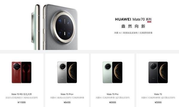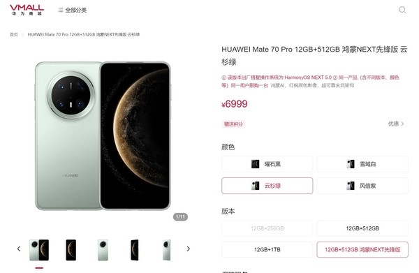 在购买页面,这次Mate70 Pro和其他三个版本会有一个明显区别,就是会多一个12GB+512GB鸿蒙NEXT先锋版的选择,这就代表着消费者想要体验纯血鸿蒙的时候,选择这个版本就行,而其他版本搭载的则是HarmonyOS 4.3。这两个版本最大的区别就是纯血鸿蒙(HarmonyOS 5.0)不再兼容安卓应用,体验更为极致,但是生态暂时有所缺失。而HarmonyOS 4.3版本生态和此前无异,都能正常使用。所以大家在选择时要根据自己的实际情况购买。最后就是价格层面了,华为Mate70起售价5499元,Mate70 Pro起售价6499元,Mate70 Pro+起售价8499元,Mate70 RS非凡大师起售价11999元。