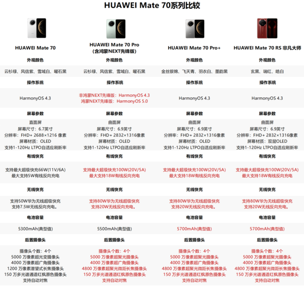 在发布会上余承东也讲了这次Mate70 Pro+运用了新材质,那就是机身中框采用高亮钛,这是铝合金材质的Pro款和标准版所不具备的。在高亮钛的加持下,Pro+和非凡大师机身耐磨能力提升5倍。而在正面的第二代昆仑玻璃、背部的锦纤材质上,它们都是一样的,耐摔耐刮能力主要差别就在Pro+的高亮钛上。而在正面的颜值上,标准版依旧是单挖孔,而Pro系列则是三挖孔,并且可以一键登岛,在视觉上会有所变化。当然,这里也存在着3D人脸识别的区别,Pro系列是标配,并且支持口罩解锁和暗光解锁。至于说Mate70 RS非凡大师,主要区别在于机身设计和材质上,这次有玄黑、皓白、瑞红三种配色,经典的传奇星钻设计、陶瓷材质,处处都能彰显非凡。当然,在机身重量上,肯定也是最重的,达到了251g,其中瑞红是256g,其中的玄机大家可以猜猜看。另外就是,四款产品均做到了支持IP68&IP69级防尘抗水能力。屏幕与影像,取舍之关键屏幕大小,我们在前边也给大家说明了,标准版是偏小一点的,Pro系列更大。而在屏幕素质上,四者大差不差,分辨率都是FHD+级别,均支持10.7亿色、P3广色域、1-120Hz LTPO自适应刷新率、1440Hz高频PWM调光、300Hz触控采样率。从目前的纸面参数来看,70系列是一致的,而非凡大师则是运用了双层OLED技术,峰值亮度可以达到3500nit,而其他是2500nit峰值亮度,在强光下显示效果有所区别。
