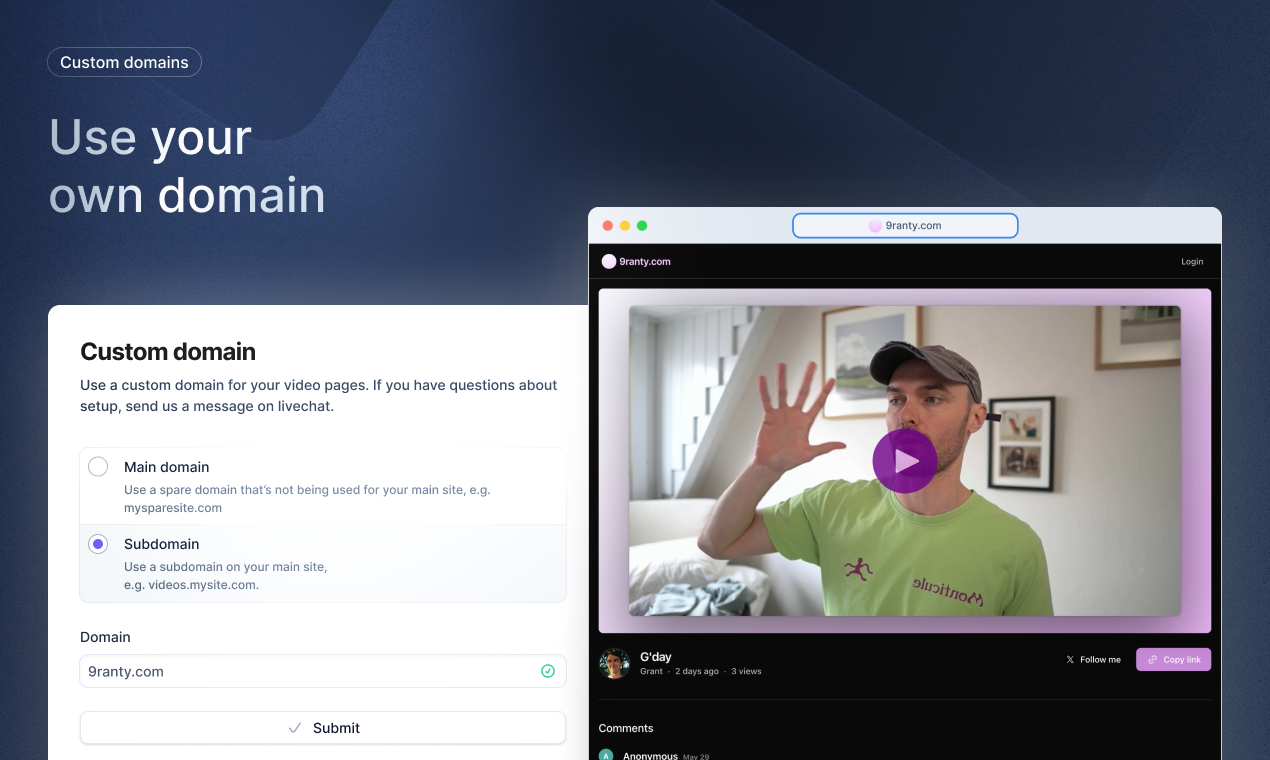 Create and share videos as a native part of your brand. Add your own logo, color scheme, custom domain and more. With Tella Premium your videos - product demos, tutorials, online courses, 1:1 sales videos - are always on-brand.
