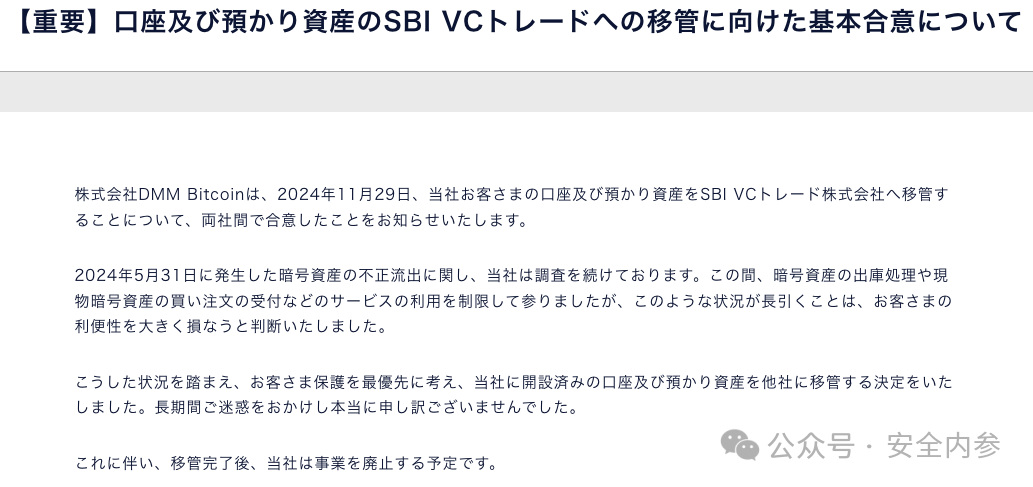 12月2日,DMM Bitcoin宣布,计划将所有客户账户及公司资产转移至另一家加密货币公司SBI VC Trade。后者是日本金融服务巨头思佰益(SBI)集团的子公司。