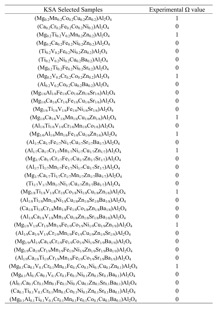 在研究的初始阶段,研究人员构建了一个包含 14 种过渡金属的附加库,理论上,四面体配位中心位置和八面体配位中心位置可以容纳 5 到 10 种金属元素,且以等摩尔比例分布。因此,潜在的 HESOs 候选总数为 14,443,这构成了研究目标的催化剂空间。研究人员利用 Kennard-Stone 算法从中采样 305 个数据点,这些样本随后被合成,并对其晶相进行了表征,如下表所示: