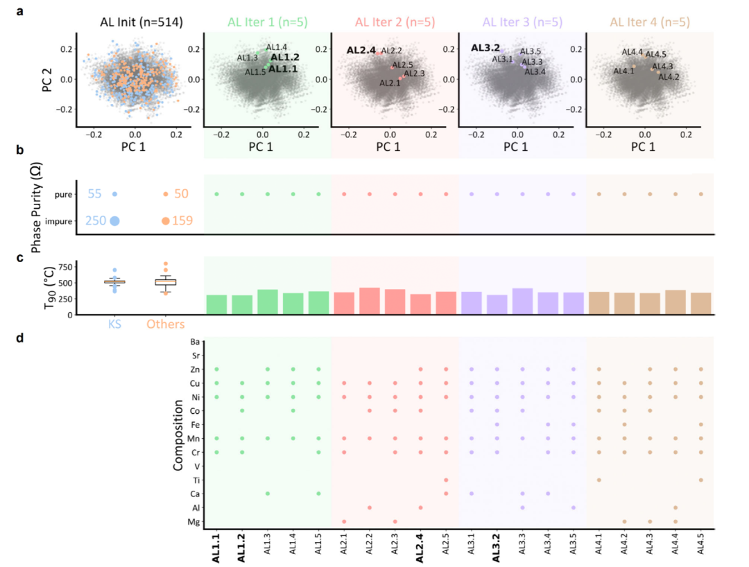 通过 AL 选出的 20 个样本中,没有一个被发现是非单相,显示出 0% 的杂质率。这与初始数据集形成鲜明对比,初始数据集的杂质率高达 84%,如上图 (b) 所示,杂质减少表明了所提出的 AL 方法在识别纯样本方面的有效性。另外,AL 选出的样本 T90 值为 357 ± 32 °C,显著低于初始数据集的 T90 值 (513 ± 66 °C),这一结果表明,所提出的 AL 算法能够高效找到具有更高催化活性的 HESOs。