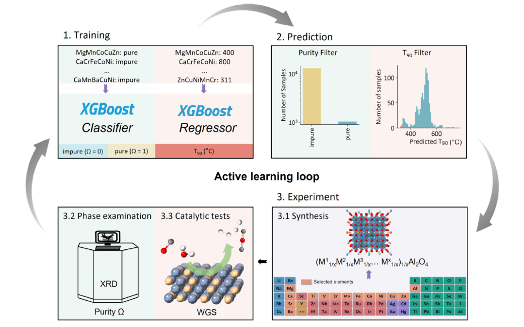 在每次迭代中,使用 XGBoost 分类器预测 HESOs 的相纯度,仅考虑由纯度分类器预测概率超过 50% 的样本,并利用 XGBoost 回归器预测其催化活性,接着选择被预测为纯相且具有最高催化活性的样品 (T90 值最低的前 5 个样本) 进行实验,并将实验数据整合到下一次迭代的训练集中。此迭代循环持续进行,直至无法发现具有高催化活性的催化剂为止。