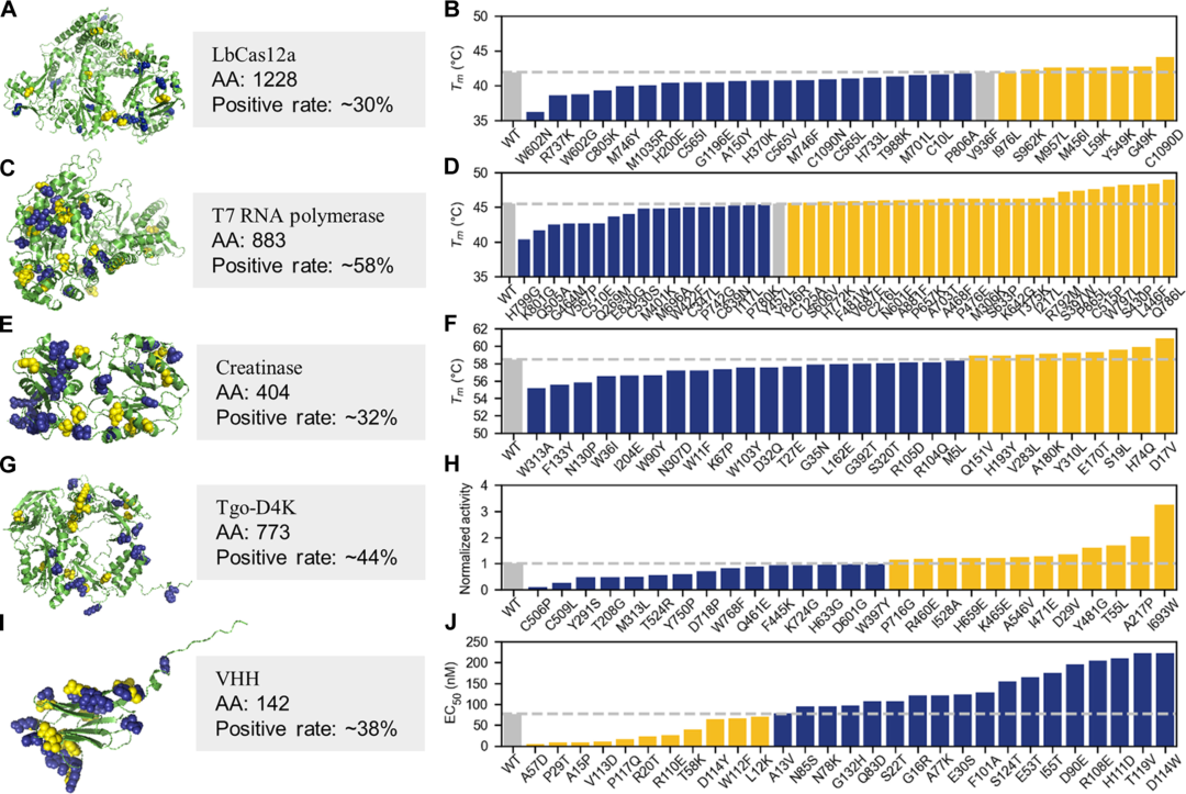 在 top 30-45 个单位点突变的实验检验中,超过 30% 的 AI 推荐单点突变体在关键性能,如热稳定性、酶促活性、抗原-抗体结合亲和力、非天然核酸聚合能力或者极端碱性条件下的耐受性等方面明显优于野生型蛋白,个别蛋白质的阳性率超过 50%。