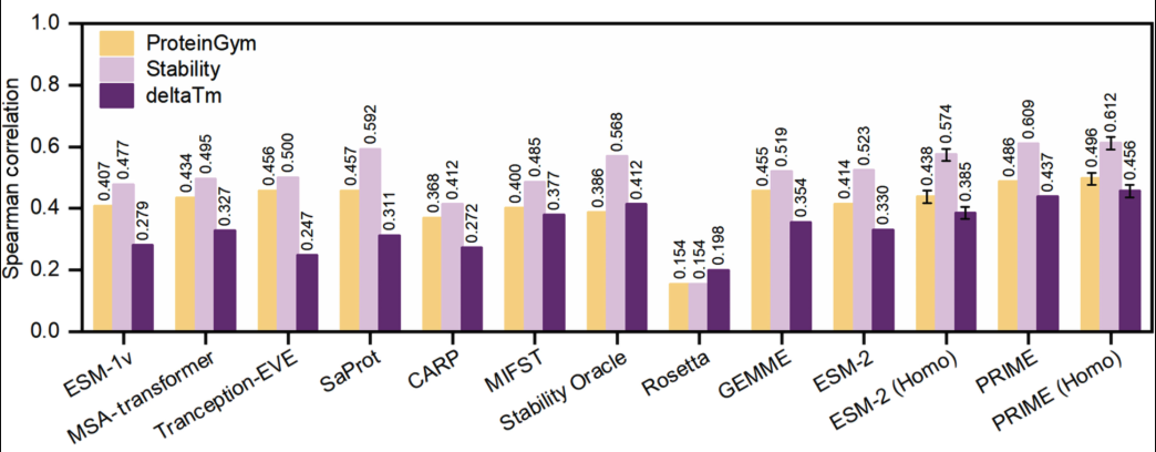 研究人员通过实验比较了 PRIME 与当前最先进模型在热稳定性上的 zero-shot 预测能力,其中包括了深度学习模型 ESM-1v、ESM-2、MSA-transformer、Tranception-EVE、CARP 、MIF-ST、SaProt、Stability Oracle,以及传统计算方法 GEMME 和 Rosetta。