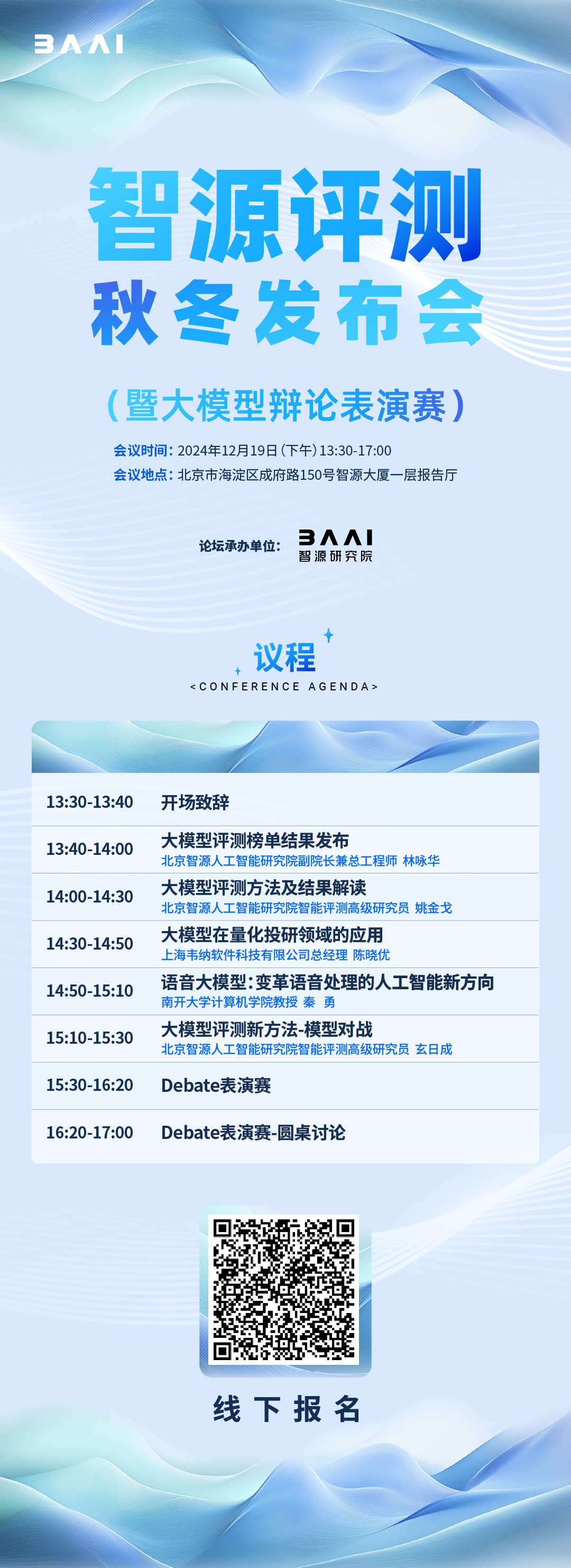 2024年12月19日13:30-17:00,智源研究院将举办“智源评测秋冬发布会暨大模型辩论表演赛”,发布最新的国内外开闭源大模型的综合评测结果以及特色专项榜单,解读智源评测的方法与技术创新,欢迎报名线下参会或预约直播。