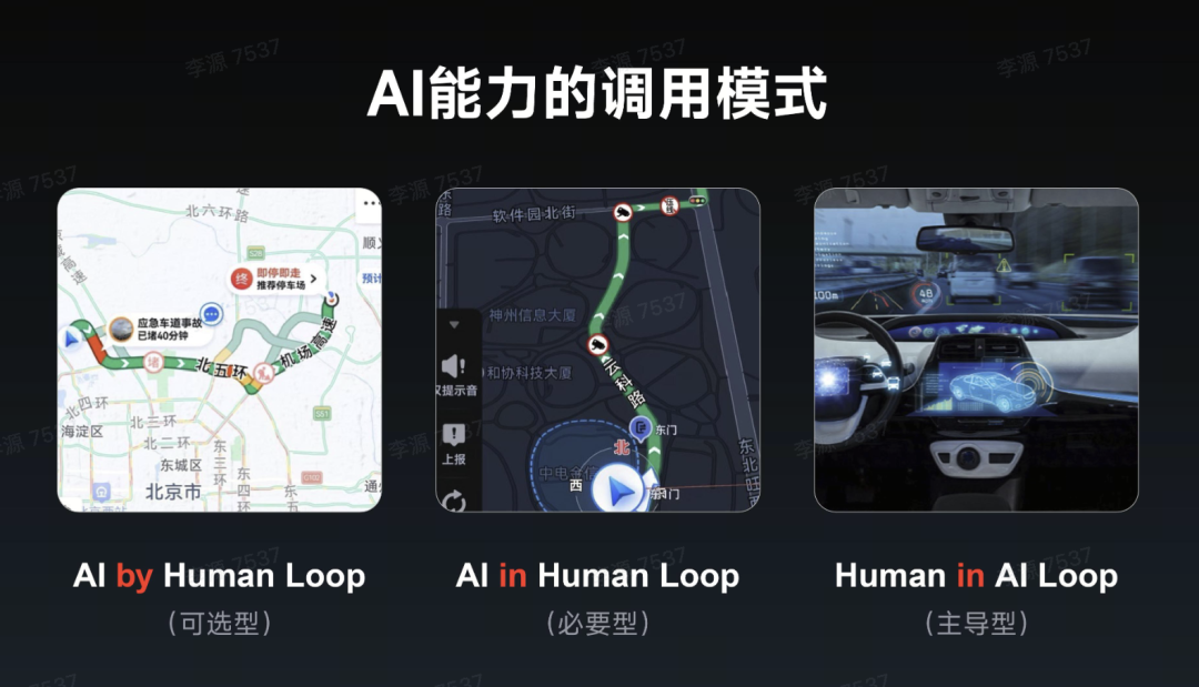 以地图导航举例子,有三种不同的模式:一、AI by Human Loop,AI 作为工具辅助人完成驾驶。二、把 AI 能力设计到链路中,就像开车过程中打开导航,当需要右转弯时就提示你,这个过程是由人和 AI 共同协同完成。终极状态就是类似于智能驾驶,绝大部分的情况下都是由 AI 来去完成驾驶过程,真人只需要在必要时做一些介入和干预就可以了。