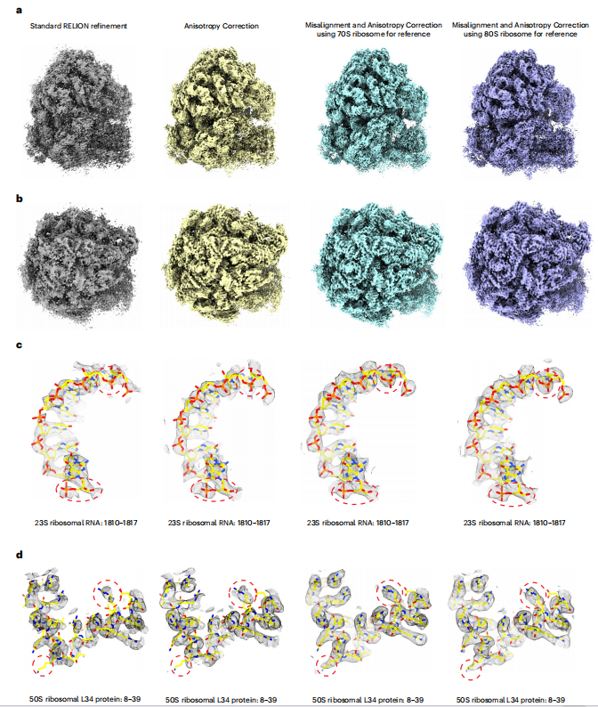 * a,b-不同重建方法重建的核糖体图,c,d-具有拟合原子模型的代表性密度区域(黄色)
