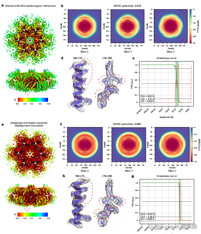 * a-根据标准 RELION 重建的 HIV-1 局部分辨率图,b-用于标准 RELION 细化的 3DFSC 的切片,c-根据标准 RELION 细化结果计算的 FSO 和Bingham 检验的 P 值,d-从冷冻电镜图中选择的氨基酸残基和聚糖的代表性密度,e-根据 spIsoNet 各向异性校正技术重建的 HIV-1 局部分辨率图,f-spIsoNet 各向异性校正的 3DFSC 的切片,g-根据 spIsoNet 各向异性校正结果计算的 FSO 和 Bingham 检验的 P 值,h-从冷冻电镜图中选择的氨基酸残基和聚糖的代表性密度