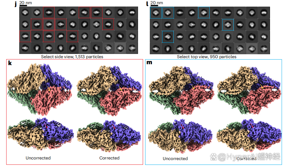 如下图 j-m 所示,从二维类平均值中选择侧面视图粒子和顶面视图粒子,研究人员整理了两个具有偏好取向的粒子子集,并执行了标准的 RELION 三维重建。测试结果表明,单独的各向异性校正模块就能有效地减少由顶面视图主导或侧面视图主导取向引起的三维重建失真 (artifacts)。
