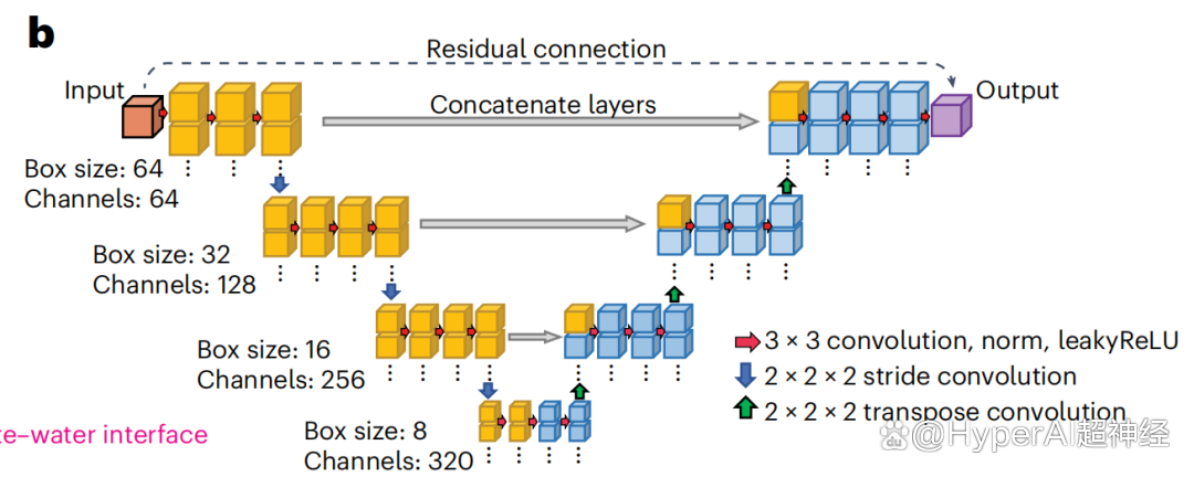 spIsoNet 使用的神经网络基于 U-net 网络架构,这是一种在生物医学图像恢复和分割中得到了广泛认可的深度学习模型。如下图 b 所示,通过堆叠卷积块,基于编码器-解码器架构来构建 U-net。