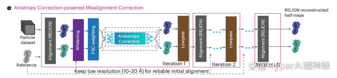 当完成各向异性校正后,研究人员得到了更精确的粒子取向参数以及两个由 RELION 重建的半图。这些半图在每次三维精细化迭代后,会经过包括白化 (whitening) 和 FSC 加权 (FSC weighting) 在内的后处理滤波器处理,以进一步提升图像质量。然后,spIsoNet 各向异性校正模块会对这些过滤后的半图进行处理,处理后的校正半图会经过低通滤波 (Lowpass),以达到与其分辨率相匹配的标准。这两个经过过滤和校正的半图,将被用作后续取向估计的参考依据。