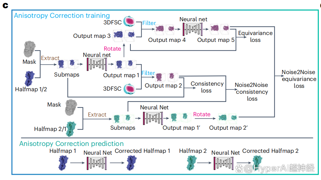 研究人员设计了一款各向异性校正模块,目的是为了提高冷冻电镜图像的清晰度。如下图 c 所示,该模块的运作将两个半图 (halfmap)、一个三维傅里叶壳层相关 (3DFSC) 体积以及一个溶剂掩模作为输入数据,通过集成 3DFSC 算法,最小化 4 个不同类型的损失函数加权和,包括一致性损失 (Consistency loss)、等变性损失 (Equivariance loss)、噪声到噪声一致性损失 (Noise2Noise consistency loss) 和噪声到噪声等变性损失 (Noise2Noise equivariance loss),进而提高冷冻电镜图像的质量。