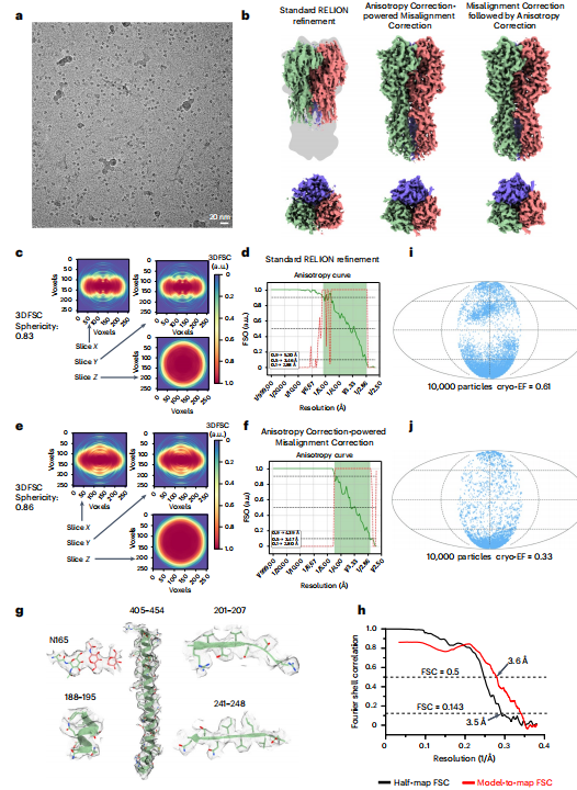 *a-代表性冷冻电镜显微照片,b-不同方法重建的 HA 三聚体低温电镜图,c-用于标准 RELION 细化的 3DFSC 的切片,d-根据标准 RELION 细化结果计算的 FSO 和Bingham 检验的 P 值,e-spIsoNet 错位校正的 3DFSC 的切片,f-根据 spIsoNet 错位校正结果计算的 FSO 和Bingham 检验的 P 值,g-从冷冻电镜图中选择的氨基酸残基和聚糖的代表性密度,h-校正后的 HA 三聚体 FSC 曲线,i,j-不同方向分布结果和对应的 cryoEF 分数