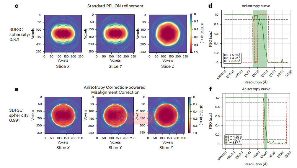 进一步地,如下图 c-f 所示,错位校正后的图像提升了图像到模型的傅里叶壳层相关性,三维傅里叶壳层相关性 (3DFSC) 接近球形 (0.991),与原始图像相比,纠偏之后还显示出更大的各向同性傅里叶壳层占据区域 (FSO)。