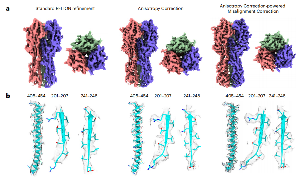 * 从左至右依次均是标准 RELION 细化、各向异性校正和各向异性校正驱动的错位校正。