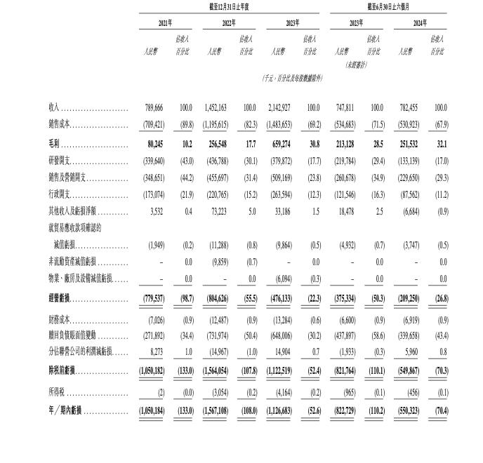 亏损方面,报告期内,极智嘉期内亏损分别约为10.50亿、15.67亿、11.27亿、5.50亿元;经调整EBITDA(非国际财务报告准则计量)分别为-6.72亿、-6.74亿、-3.39亿、-1.58亿元;经调整净亏损率分别为96.7%、56.1%、20.7%、24.8%,呈大幅收窄趋势。