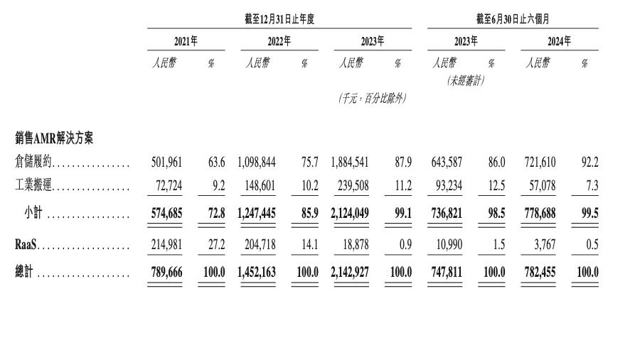 招股书显示,2021-2023年及今年上半年(下称:报告期),极智嘉的收入主要来自销售AMR解决方案,包括仓储履约和工业搬运。2021-2023年间,该部分收入分别约为5.75亿、12.47亿、21.24亿元,复合年增长率为92.3%;今年上半年则为7.82亿元。截至2024年6月30日,公司的关键客户复购率约90%,远超行业平均水平。