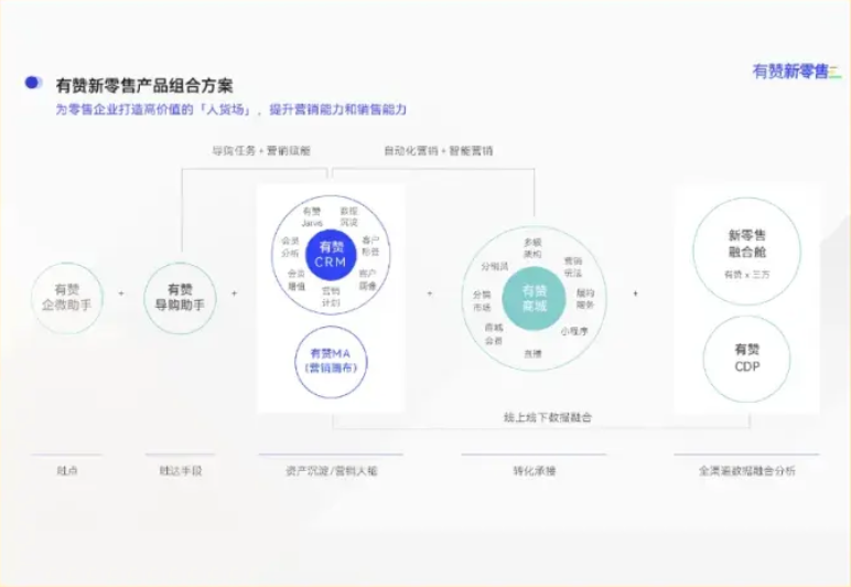 在存量经济时代,全域经营成为吸引消费者的关键。有赞新零售推出了一体化产品组合,打造「连接-触达-转化-忠诚」消费者旅程可复制的运营方法论,全维度整合消费者数据形成精准客户画像,开展自动化精准营销和会员增值营销,帮助商家提升复购率、客单价和客户转化率,实现全生命周期、全场景、全链路业绩提升。