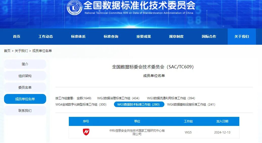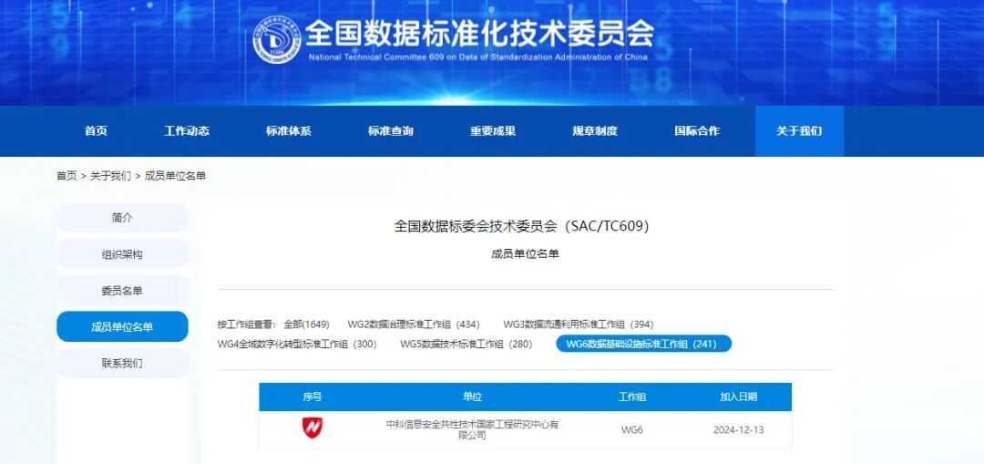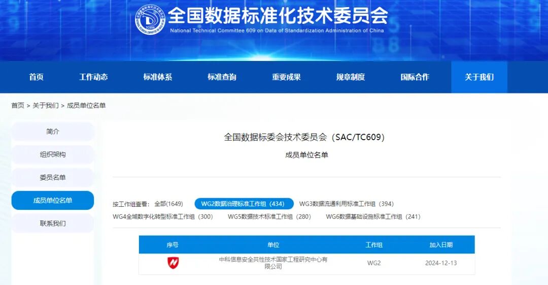 近日,全国数据标准化技术委员会公布了成员单位名单,中科信息安全共性技术国家工程研究中心有限公司(以下简称“工程中心”)入选成为WG2数据治理标准工作组、WG5数据技术标准工作组、WG6数据基础设施标准工作组成员单位名单。