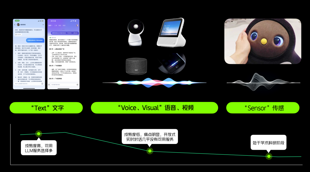 我们先看交互这个维度。在做一款个人 AI 应用时,不管是软件类的,还是硬件类的,在许多场景,需要的不仅仅是 LLM 纯文本交互能力,而是拟人且实时的语音、视觉理解互动能力,也就是下图中间部分的交互能力。