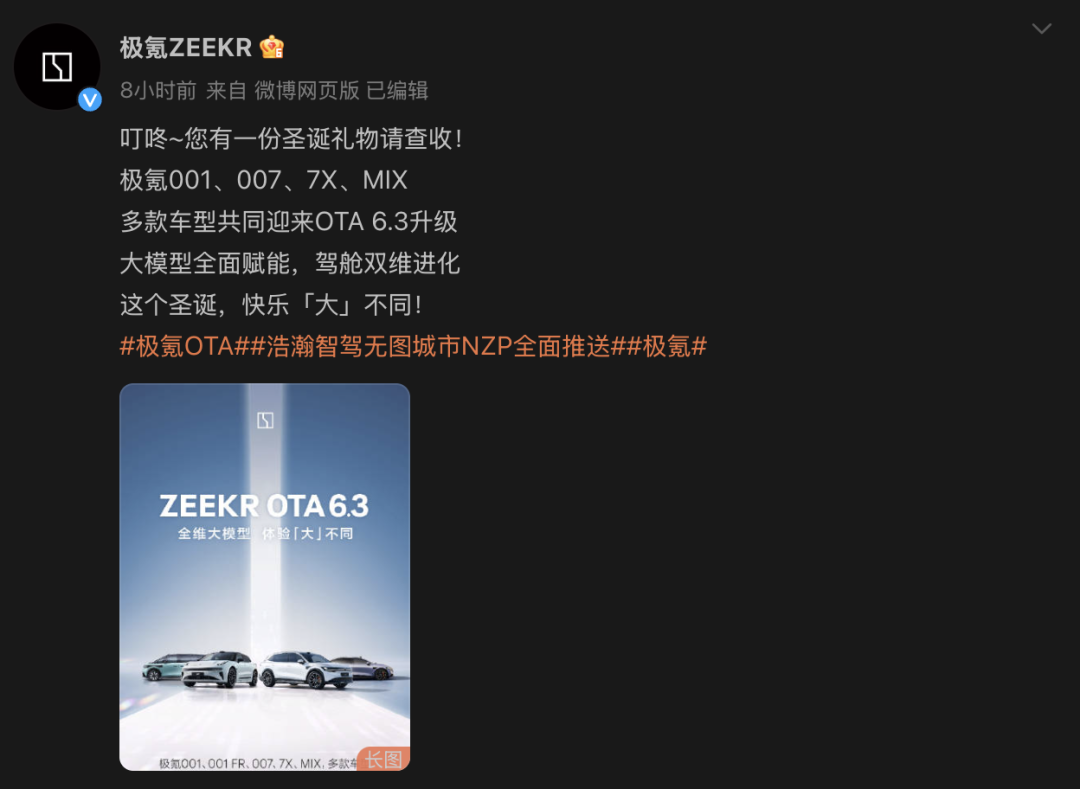 极氪官方今日宣布,极氪 001、007、7X、MIX 等多款车型共同迎来 OTA 6.3 升级。