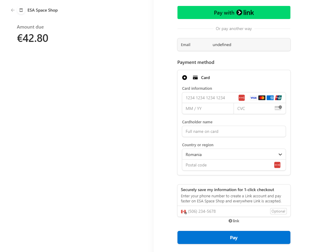 ESA 的网上商店加载虚假的 Stripe 支付页面