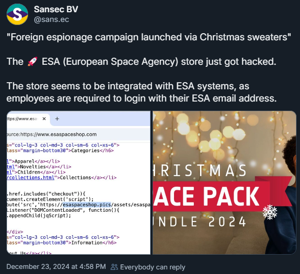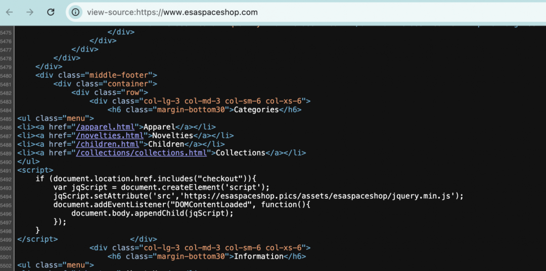 Sansec 发现用于泄露信息的域名与销售 ESA 商品的合法商店使用的域名相同,但具有不同的顶级域名 (TLD)。虽然欧洲机构的官方商店在 .com TLD 中使用“esaspaceshop”,但黑客在 .pics TLD 中使用相同的名称(即 esaspaceshop[.]pics),如 ESA 商店的源代码所示: