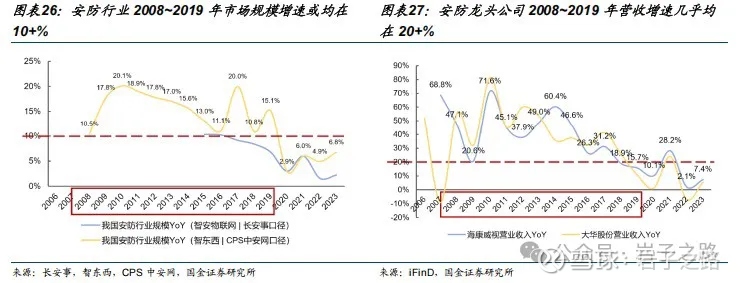 据智东西与 CPS 中安网统计口径,2008~2019 年我国安防行业市场规模增速均在 10%以上,2020 年开始回落至个位数增长。同期,安防行业两家龙头公司海康和大华营收增速几乎均在 20+%,2017~2019 年之后明显回落至 15%以下。行业与龙头公司高增速时期与 G 端安防政策覆盖期基本吻合。