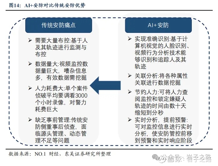 AI 推动传统安防转型升级,“AI+安防”发展空间较大。人工智能等技术在安防领域的应用,推动安防产业从传统“人防”“事后追溯”走向“技防”“实时监控”与“事前预防”智慧时代。