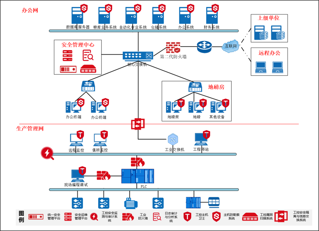 在办公网单独划分出安全管理区域,部署统一安全管理平台、日志审计与分析系统、安全运维管理系统、工控漏洞扫描系统等设备,实现全网事件、资产、风险的安全感知、集中管理、一体化运维,提升运维效率,强化实战能力。
