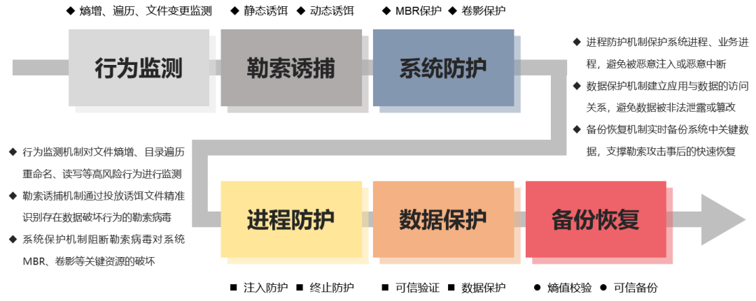 在办公电脑、业务系统服务器部署主机防勒索系统,通过接管底层驱动监测函数的调用,能够及时发现异常行为,有效识别并阻断勒索攻击;