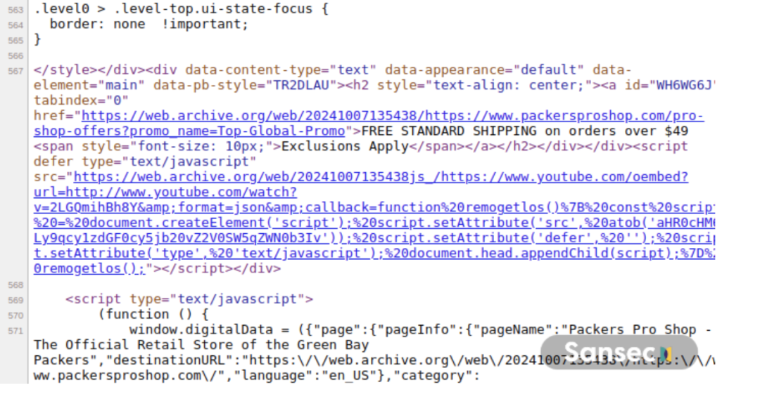 “2024 年 10 月 23 日,我们收到警报,第三方威胁行为者在 Pro Shop 网站上插入了恶意代码,得知此事后,我们立即暂时禁用了 Pro Shop 网站上的所有支付和结账功能,并开始调查。”Packers 零售业务总监 Chrysta Jorgensen解释道。