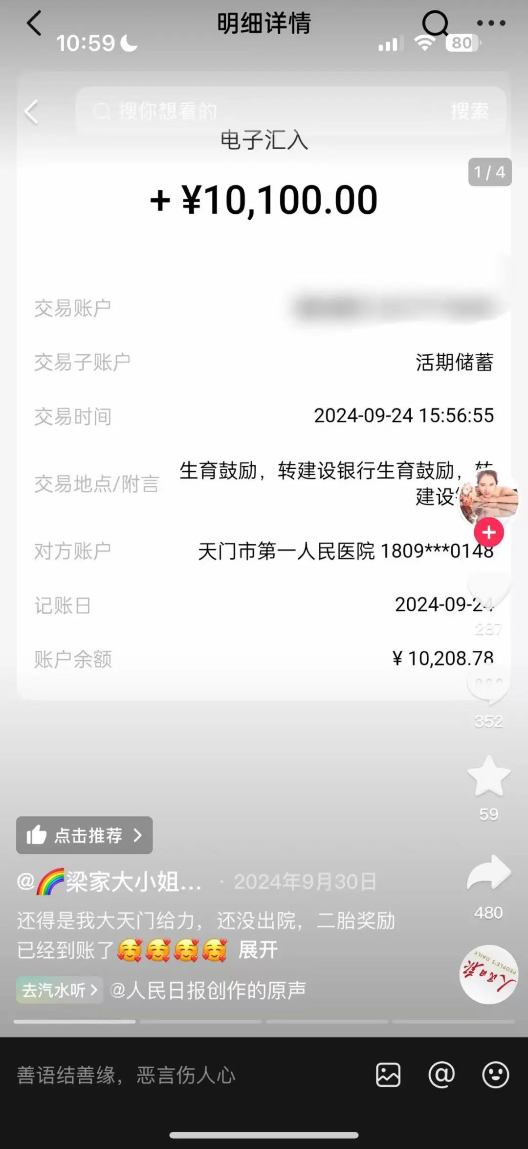 “都还没出院,昨天办的卡今天补贴就到了……”抖音平台上,有天门宝妈晒出自己的银行到账截图。