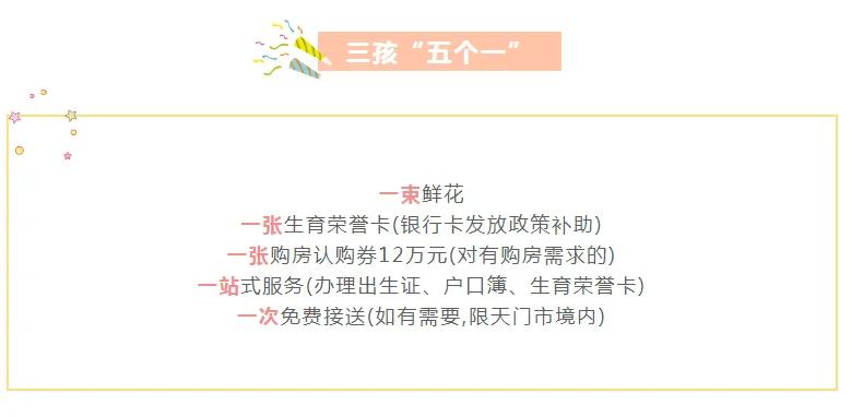 比如三孩“五个一”,天门市的每位三孩妈妈都可以领取到一束鲜花、一张生育荣誉卡、一次购房认购券,一站式服务和一次免费接送。