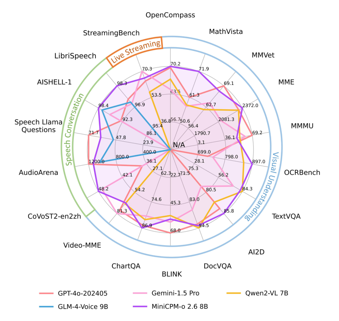 在实时流式视频理解能力的代表榜单 StreamingBench 上,它取得实时流式全模态开源模型 SOTA;在视觉理解能力上,实现端侧全模态模型 SOTA;在语音理解方面,它超越「Qwen2-Audio-7B-Instruct」,实现通用模型开源 SOTA(包括 ASR、语音描述等任务);在语音生成方面,它超越「GLM-4-Voice 9B」,实现通用模型开源 SOTA;