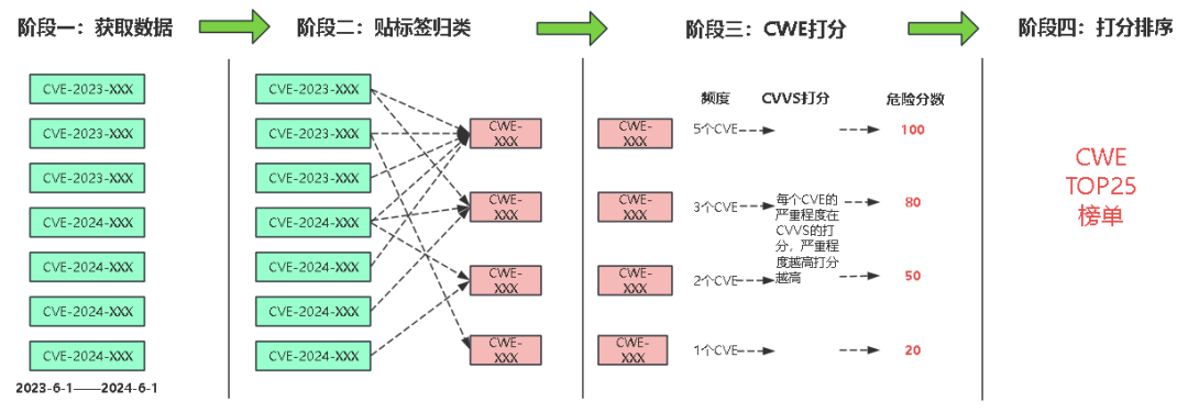 MITRE TOP25团队首先采集2023-6-1至2024-6-1 期间发布的所有CVE记录;然后通过关键字匹配、邮件确认等方式将所有CVE做了CWE的映射归类;之后结合了频率(CVE归类到CWE上的次数)和每个CVE的平均严重程度(通用漏洞评分系统CVSS基本分数)对所有900多个CWE类型进行了“危险分数”打分;最后根据“危险分数”排序,得出的“TOP25”。