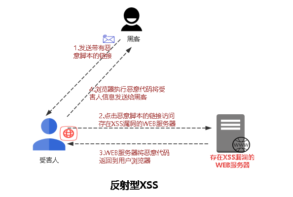 反射型XSS:攻击者公开发布URL或直接通过电子邮件发送给受害者URL。受害者点击URL后,网站将攻击者的内容反射回受害者,受害者的浏览器会执行这些内容。