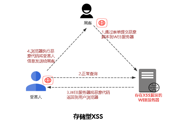 存储型XSS:攻击者将危险数据存储在可信数据存储中。危险数据随后被包含在动态页面。受害者访问恶意页面,受害者的浏览器会执行这些恶意内容。